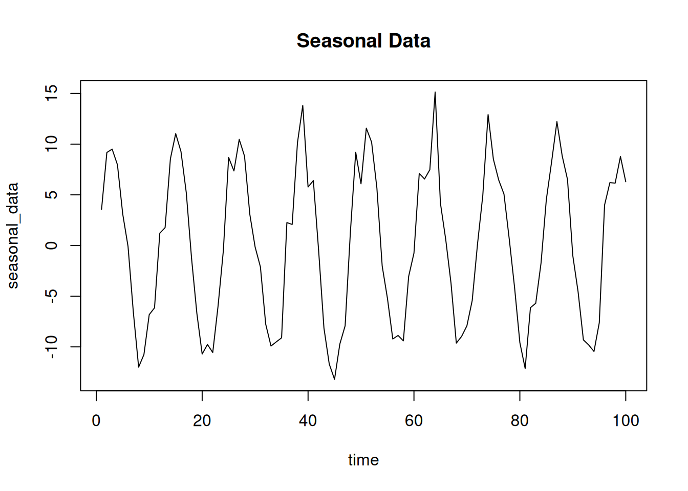 seasonal_data <- 10 * sin(2 * pi * time / 12) + rnorm(100, sd = 2)